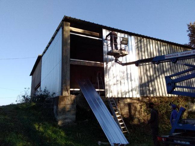 - Mise en place des nouveaux supportages horizontaux (tube carré 80x80). Ils seront fixés à l'aide de platines intermédiaires vissées dans le poteau béton de l'angle du hangar et vissées/ traversant dans le mur à l'autre extrémité. - Pour la façade Nord, pose d'un poteau vertical intermédiaire (tube de 100x50). - Pose du bardage vertical des façades Nord et Ouest. - Remise en état du bardage au nord de la toiture. - Déblaiement du chantier / Évacuation des encombrants